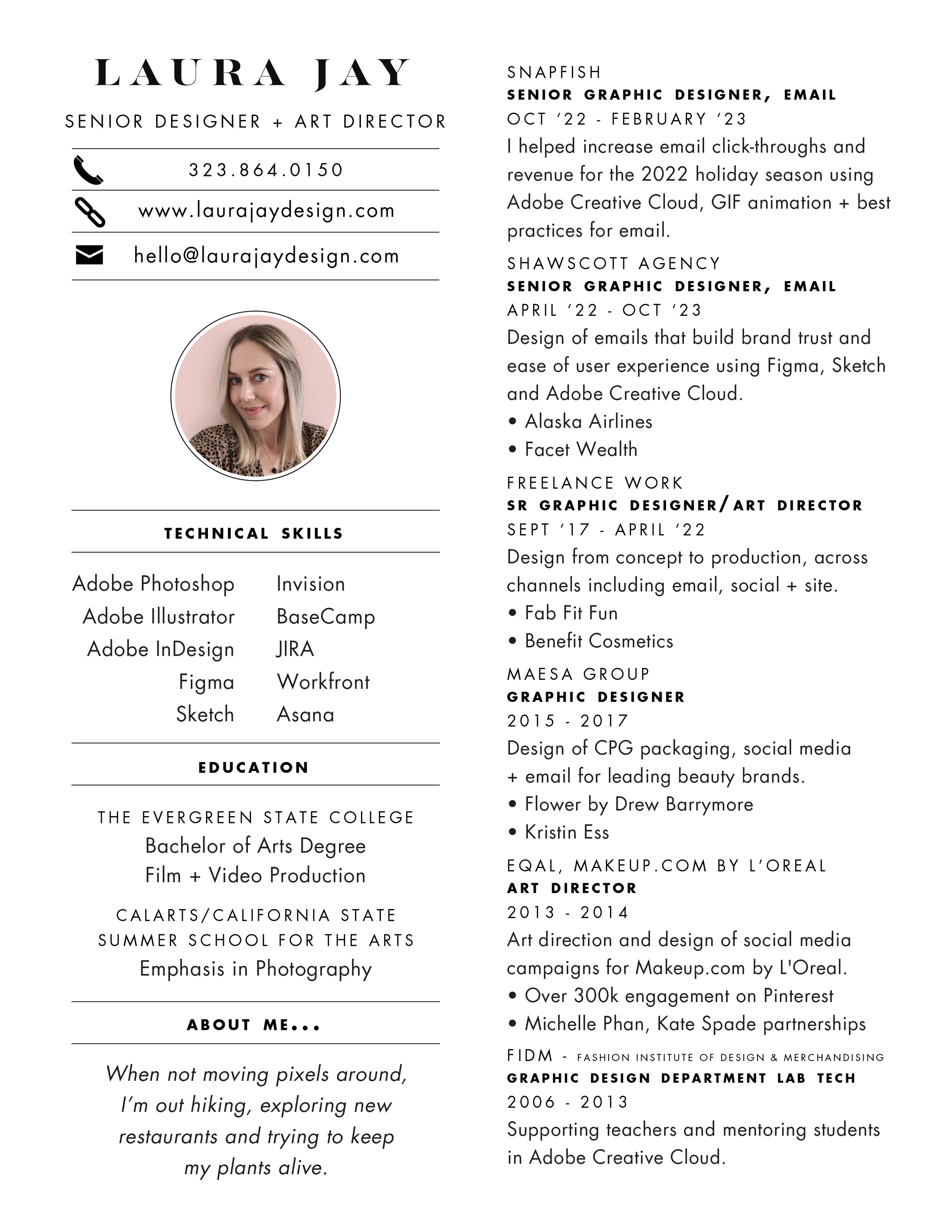 Hello! Thank you for your interest in my experience. Shoot me any questions at: hello@laurajaydesign.com